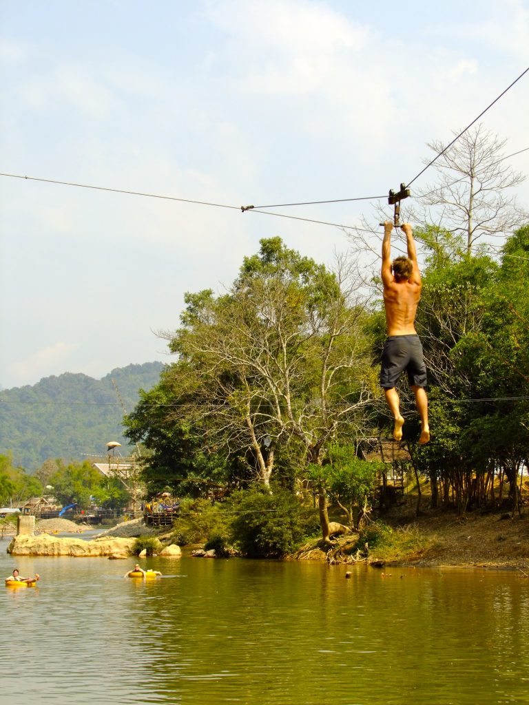 In Vang Vieng, Laos we had one of the best days of our lives. The river was lined with platforms to jump from, rope swings, and zip lines. Here my friend Ben throws a gainer from a 30 ft platform.