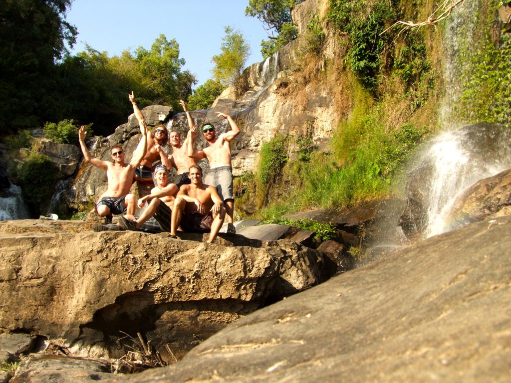 The whole crew celebrates a great day playing in rivers and waterfalls in Northern Thailand.
