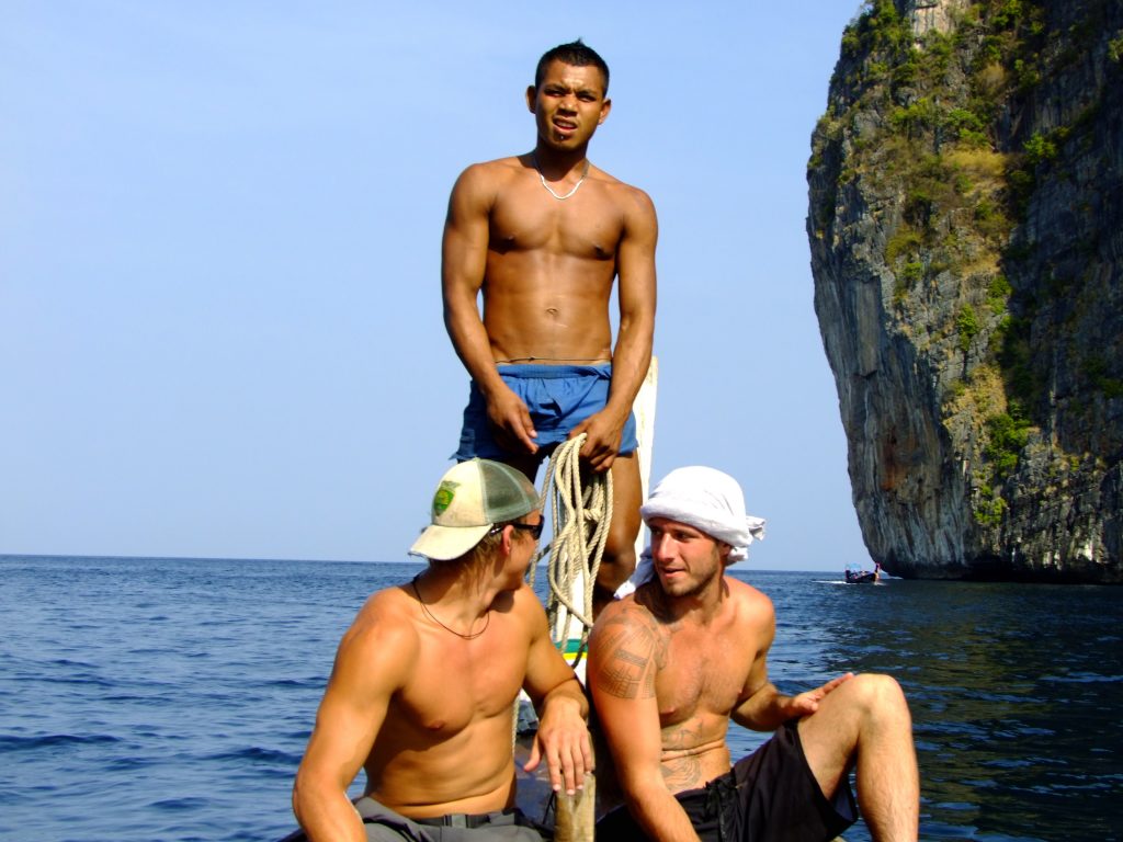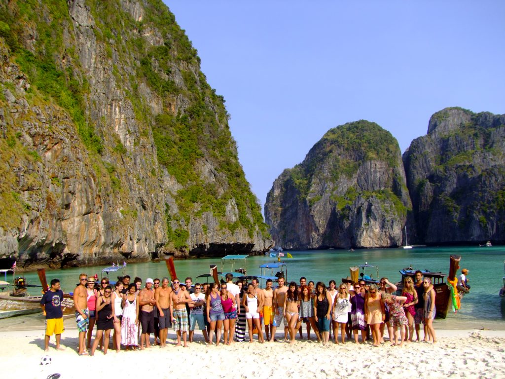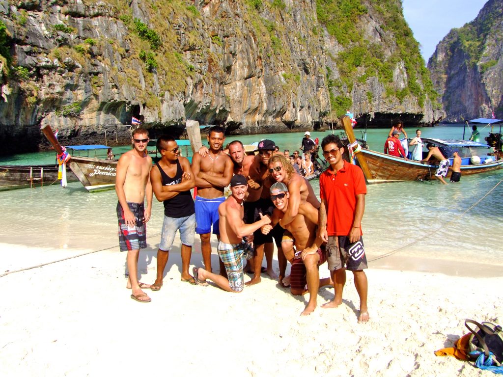 A few of the Thai guides join us for a picture just before heading out of Maya Bay. The waters here have bioluminescent plankton and at night when the water is splashed around you can see them glow.