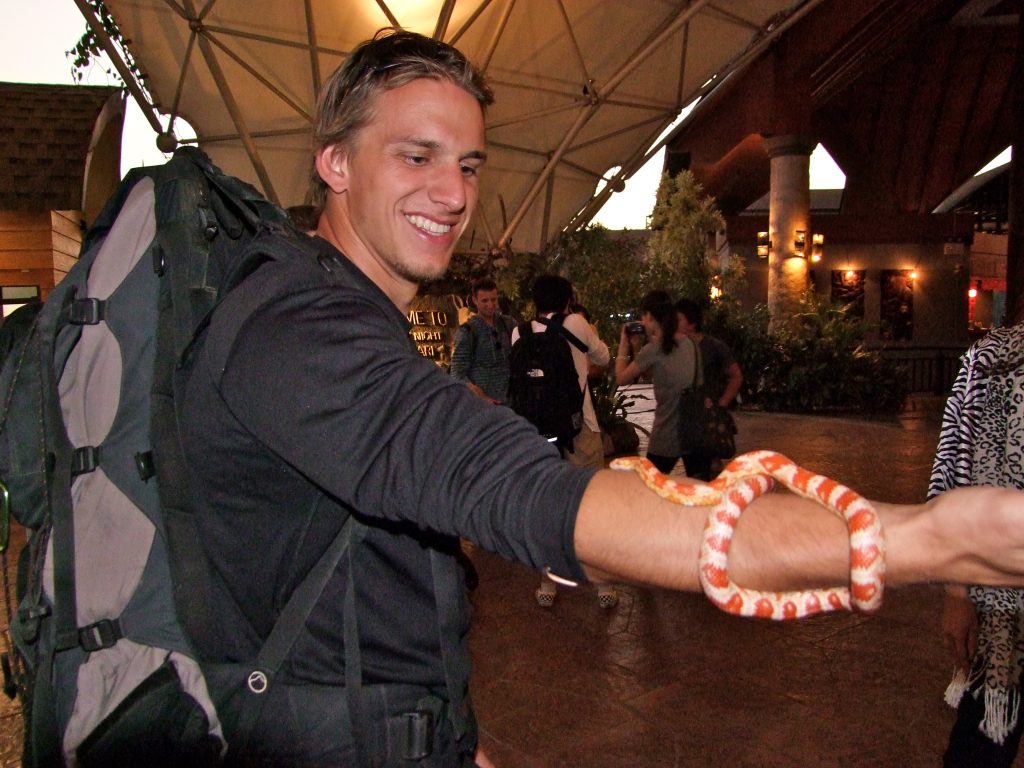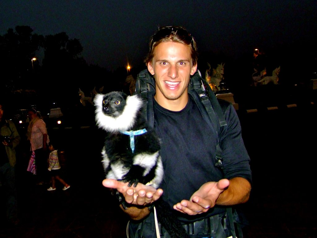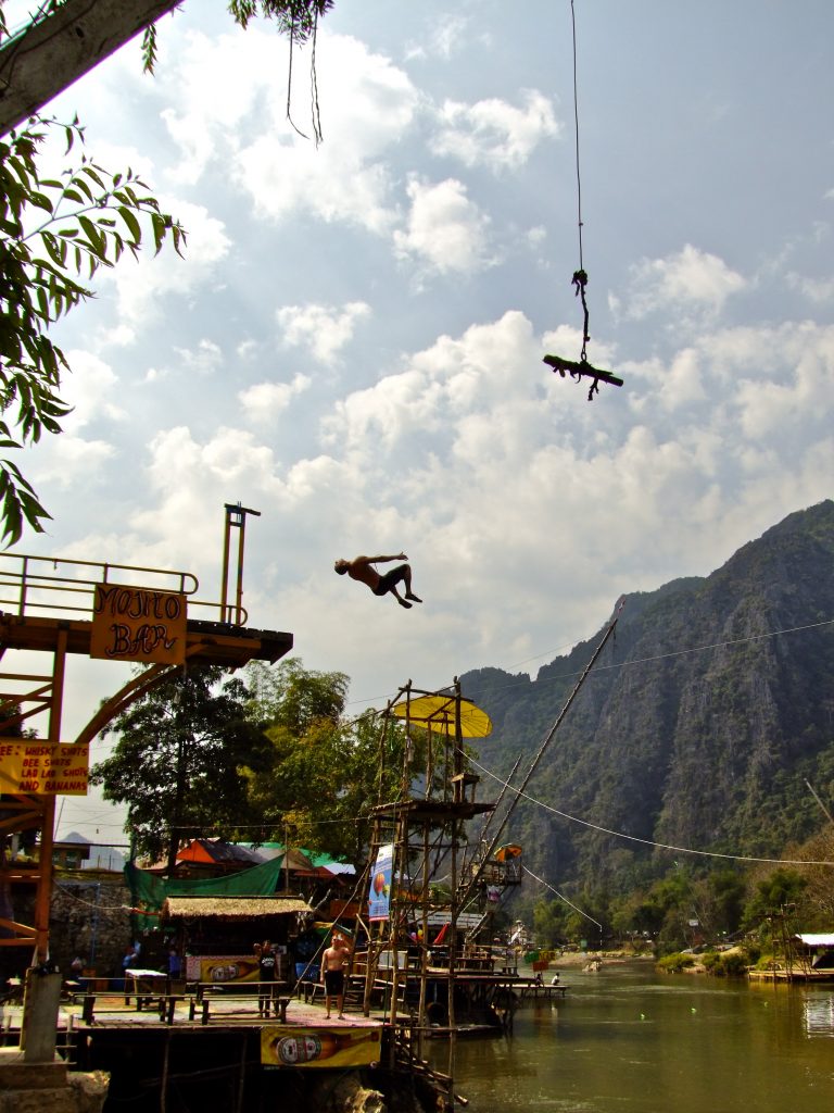 In Vang Vieng, Laos we had one of the best days of our lives. The river was lined with platforms to jump from, rope swings, and zip lines. Here my friend Ben throws a gainer from a 30 ft platform. Mid-backflip action in Laos. The day starts by renting tubes and floating down the river where locals pull you in to different bars and restaurants where you can eat, drink, and play until the sun goes down. Tubers float down the river as I slide down this 200ft long zipline. To make things more interesting we ended up blind folding ourselves so you didn’t know when you would hit the stopper. It made for some pretty funny flips and belly flops. In Northern Thailand we visited this interactive zoo. We had the opportunity to hold snakes, get kissed by an elephant, and feed a baby tiger. Black and White Ruffed Lemur. These lemurs are on the endangered species list mainly due to deforestation and habitat loss. This zoo breeds these lemurs and releases them into the wild. The whole crew celebrates a great day playing in rivers and waterfalls in Northern Thailand. This off the beaten path location took us into a small Thai town where the locals spoke very little English but were some of the friendliest people we met during our travels. I’m sipping on some homemade Thai whiskey while wielding a genuine Thai machete. We later are pig intestine soup. Needless to say, this was one of our more interesting experiences. A roadside stand sells local dried fruits and other handmade Thai souvenirs. Our visit to a Buddhist temple put us is a zen like state as we toured the beautifully manicured grounds and gold Buddha statues. -